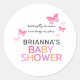 Mignons autocollants ronds personnalisés en baby shower décorés de papillons roses et de texte coloré. Ce design est parfait pour un événement en l'honneur d'une petite fille.