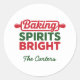 Add a timeless touch to your holiday packaging with this classic “Baking Spirits Bright” custom sticker. Featuring bold red and green lettering and a personalized family name, it’s perfect for labeling baked goods, gifts, and festive party favors. Ideal for cookie swaps, kitchen gifts, or homemade treats, this round holiday sticker brings warmth, cheer, and a dash of tradition to every package.