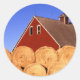 Voici une photo de quelques balles de paille à côté d'une grange.
