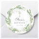 Autocollants de baptême moderne personnalisables avec un délicat lis de la vallée design floral autour d'une croix dorée ornée, sur un arrière - plan propre avec lettrage élégant.
