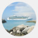 Ancré en toute sécurité au large, loin des rochers et des récifs, un bateau de croisière de classe liberté repose sur l'île tropicale privée de Coco Cay, sur la ligne de croisière, aux Bahamas.