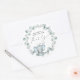 Baguette autocollante pour votre bébé garçon douche merci cartes et faveurs de fête avec "Merci" en typographie simple et un script élégant avec un coeur swash et une aquarelle d'un bébé éléphant bleu sur une couronne de vert d'eucalyptus sauge.