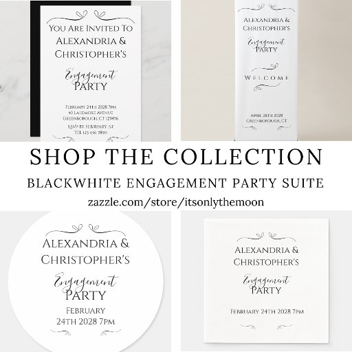 Celebrate your engagement with this minimal black and white design featuring classic, elegant, script typography. Perfect for a modern or formal party, this chic aesthetic suits any couple. Contact the designer for help with personalization and customization.