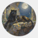 A black panther themed stickera. On the front is an illustration of a majestic black panther with fur like molten black and gold, laying on a cliff ledge bathed in ethereal moonlight. Intricate carvings adorn crumbling stone pillars, and bioluminescent flora casts a soft, otherworldly glow. The scene is rendered in a rich, textural oil painting style with thick, .