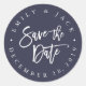 Chic et moderne enregistrer la date autocollants sont les noms et la date mariage dans le texte circulaire entourant "enregistrer la date" dans la typographie de brosse en lettres blanches. L'arrière - plan bleu nuit est frappant et élégant pour une façon parfaite de terminer votre enregistrement des mailings de date!