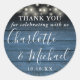 Symbole de signature rustique pour mariage merci classique collant rond avec de jolies lampes à cordes et des noms de style signature sur un arrière - plan de panneaux de bois bleu. Personnalisez avec vos informations de remerciement spéciales en typographie blanche chic. Conçu par Thisisnotme©