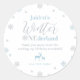 Cet autocollant mignon 1er anniversaire présente des flocons de neige bleu et argent clair et une typographie stylisée "Winter ONEderland". Idéal pour une fête d'hiver à thème de pays des merveilles. Les invitations et les fournitures de fête correspondants sont disponibles dans ma boutique BaraBomDesign.