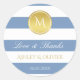 Un autocollant de remerciement personnalisé aux rayures blanches et bleues avec un monogramme d'or faux et du texte personnalisable.