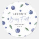 Célébrez la fête du 1er anniversaire de votre enfant avec ces Stickers populaires "Berry First Birthday". Ce design simple présente une élégante modèle décorée de bleuets d'aquarelle et de feuilles verts sur un arrière - plan blanc classique.