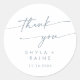 Ce sticker boho chic ardoise bleu merci mariage faveur classique rond est parfait pour un mariage minimaliste. Le design bohème moderne, bleu et blanc pâle et poussiéreux, se compose d'une calligraphie rustique simple au style unique mais classique. Personnalisez vos autocollants de faveur avec vos noms et votre date de mariage.