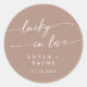 Ce taupe neutre chic boho chanceux en amour favorise un autocollant rond classique est parfait pour un mariage minimaliste. Le ton de terre brun beige design bohème moderne se compose de calligraphie rustique simple avec un style unique mais classique. Personnalisez vos autocollants de faveur avec vos noms et votre date de mariage.