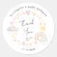 Whimsical baby girl shower Merci sticker avec "Merci" dans un script élégant et boho inspiré rose et jaune aquarelles d'un arc-en-ciel, soleil, coeurs, étoiles, lunes et nuages. Personnalisez avec le nom de la future mère et la date de la douche dans une simple typographie.