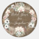 Sticker rond rustique en bois blanc fleuri Palm vert Fête des mariées de feuillage classique pour les scellés d'enveloppe, les sacs cadeaux ou d'autres décorations de douche nuptiale. Des planches en bois de grange brun foncé et patiné décorent l'oeuvre délicate et aquarelle d'élégantes orchidées blanches, le feuillage de palmiers kaki tan, des feuilles tropicaux séchés de style boho et des couronnes de sauge muettée. Copyright, Audrey Jeanne Roberts.