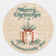 Faux burlap beige comme arrière - plan, texte vert. Joyeux Noël est écrit avec une police de style rétro. Décoré d'une boîte cadeau aux branches de pin. Personnalisez et ajoutez votre nom de famille et une année. Une image de burlap, pas un vrai tissu.