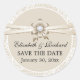 Bordure de dentelle avec mariage ruban beige Enregistrer l'autocollant Date qui comprend la bordure de dentelle écru et blanc, un ruban de satin et une fleur avec brillance métallique et diamant bijou imprimé et votre texte en noir sur couleur beige sable. Ce design modèle personnalisable est plein d'élégance et de finesse chic. Il fait partie d'un ensemble mariage parfait pour un mariage à la palette neutre.