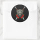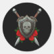 Cette conception unique présente un Jour tourbillonnant du crâne de sucre mort sur un bouclier métallique complexe. Deux épées avec des crânes de cristal sur les coudes sont croisées derrière le bouclier. Quatre roses rouges aux feuilles verts apparaissent à la base du design qui crée un beau contraste avec le métal vieilli et usé de la crête. L'armure est décorée de motifs tourbillonnants élaborés ainsi que de deux étoiles cinq points au sommet du design. Grandes rayures et couleurs métalliques donnent au motif un aspect vieillot et fatigué.
