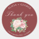 Elégant couple minimaliste mariage merci autocollant rond / mariage en faveur étiquette avec un beau bouquet rose bordeaux et rose vif et un script de typographie blanc tendance contre un arrière - plan bordeaux foncé. +++++++++ Personnalisez avec les noms et initiales de la mariée et du marié et avec votre texte personnalisé !