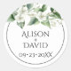 Cet élégant autocollant rond floral présente une belle branche d'eucalyptus avec des fleurs blanches et des feuilles verts sauge au sommet. Les noms du couple sont dans la typographie décorative. Il y a une fine bordure autour.