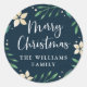 Cachez vos cadeaux de Noël ou vos mailings de saison avec ces autocollants ronds festifs avec "Joyeux Noël" et votre nom de famille ou vos noms en lettres blanches sur un arrière - plan bleu minuit, entourés de fleurs poinsettia blanches et de feuillage botanique vert aquarelle.