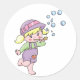 Un design d'antan avec une petite fille en casquette lilas et des shorts d'ensemble soufflant des bulles de savon d'un tuyau à bulles.