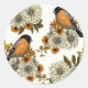 Hand-drawn illustration of a bullfinch bird on bouquet of dahlia, chrysanthemum, berries and branch of autumn leaves.