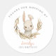 Soirée d'anniversaire à thème lapin mignon préférée autocollant avec aquarelle illustration d'un lapin avec feuillage vert et couronne de fleurs roses. Le texte dit "merci d'être passé."