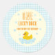 Un canard chanceux ! Premier anniversaire avec canard en caoutchouc et bulles contre un en vichy bleu clair et arrière - plan jaune pâle avec texte orange