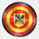 Soyez un héros allemand avec ce bouclier de style métallique stylisé comme le drapeau de l'Allemagne. L'image circulaire en forme de bouclier a une surface rayée pour un look robuste mais vintage.
