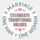 Le mariage est entre un homme et une femme. Le mariage n'est PAS entre des personnes du même sexe, des partenaires multiples, des relations incestuelles, des mineurs, des animaux ou des objets inanimés.
