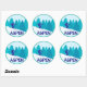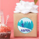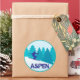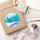 Cet autocollant présente une image circulaire en turquoise et bleu d'un skieur de neige silhouette devant les pins sur une montagne enneigée. Le bas a du texte en bleu qui dit ASPEN. Parfait pour le skieur qui aime les pistes d'Aspen, Colorado. *L'image clipart utilisée dans cette conception est protégée par le droit d'auteur de Encore Software, Inc., qui permet son utilisation à ses concédants de licence. Tous droits réservés.