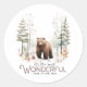 Ce design boisé de Noël d'inspiration nature et cosy présente le texte "c'est le moment le plus merveilleux de l'année." Au-dessus du texte se trouve un ours brun dans une forêt d'hiver. Cette scène animalière boisée est parfaite pour ajouter une touche de nature enneigée à votre décor de maison de vacances.
