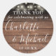 Symbole de signature rustique pour mariage merci classique collant rond avec de jolies lampes à cordes et des noms de style signature sur un arrière - plan de panneaux de bois. Personnalisez avec vos informations de remerciement spéciales en typographie blanche chic. Conçu par Thisisnotme©