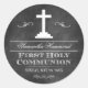 Cet autocollant de style tableau noir First Holy Communion affiche une typographie qui ressemble à de la craie sur un tableau noir. Le texte customisé est disposé sous une croix est proéminent entouré d'ornements bouclés. Grande comme enveloppe scellée ou personnaliser à utiliser avec faveurs ou comme cadeau. Disponible avec les produits correspondants. com