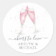 Des autocollants festifs et élégants pour votre fête de fiançailles, un dîner de répétition ou un mariage présentent une paire de verres de champagne clinquants en aquarelle, remplis de bulles roses. Personnalisez avec deux lignes de texte personnalisé en dessous ; avec "applaudissements à l'amour" et les noms du couple.