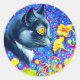 Stickers représentant la peinture animale de Louis Wain Chat in Sea of Flowers (1860-1939). Un chat noir et blanc aux yeux dorés sent les fleurs jaunes. Dans l'arrière - plan violet sont des fleurs bleues. Un cadeau merveilleux pour l'art amoureux des chats et anglais.