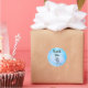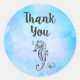 Un autocollant de remerciement avec un croquis d'encre noire d'un hippocampe et d'un coquillage. L'arrière - plan est une jolie texture d'aquarelle bleue.