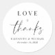 Un autocollant chic pour vos cartes de remerciement mariages et les faveurs de fête avec "Amour + Merci" dans un script moderne et une typographie élégante, vos noms et date mariage.