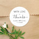 Chic autocollant de remerciement pour vos faveurs de mariage et cartes de remerciement avec "With Love + Thanks" en typographie moderne simple et un script élégant, vos noms unis par un coeur et votre date mariage.