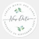 Chic, moderne et simple nouvelle date reportée mariage classique rond autocollant présente le texte Ne Date dans l'élégante calligraphie manuscrite off-black sur un arrière - plan blanc avec une touche élégante de feuillage d'eucalyptus vert. Ajoutez simplement vos noms et la nouvelle date du mariage. Conçu exclusivement pour vous par Happy Dolphin Studio. Si vous avez besoin d'aide ou de produits correspondants, veuillez nous contacter à happydolphinstudio@outlook.com . Nous sommes heureux de vous aider à faire de votre mariage la plus belle journée!
