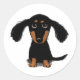 Joli chien de dessin animé noir et Tan Dachshund avec de longues oreilles et des yeux flous levant. Un adorable chien chiot Doxie qui a l'air très doux et peut-être un peu coupable. Autocollants amusants pour enveloppes, artisanat, emballage cadeau et projets do-it-yourself. Visitez Jenn's Doodle World pour encore plus de produits cool mettant en vedette ce drôle de chien de dessin animé.