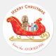 Un adorable chien Cocker Spaniel de couleur buff s'assoit parmi des paquets-cadeaux soigneusement emballés dans un magnifique traîneau de Noël rouge et or. En haut, un texte stylisé rouge indique "Joyeux Noël". En bas, votre signature personnalisée. Idéal pour les paquets ou comme sceau d'enveloppe.