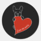 Le dessin est composé d'une ligne de dessin d'un mignon bulldog français tenant sur un coeur rouge. Des autocollants français uniques pour la Saint-Valentin et plus !