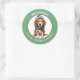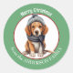 L'image d'un adorable petit chiot Beagle brun et blanc portant son écharpe d'hiver et son casquette est au centre de cet autocollant de vacances. L'image est encadrée dans une bordure circulaire verte qui contient votre texte personnalisé en blanc. Idéal pour les cartes de Noël, la correspondance et les forfaits cadeaux.
