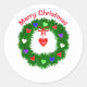 Stickers with my design of a holiday wreath decorated with blue, green, red, white and purple hearts with a big red heart hanging from a red ribbon.