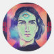 Portrait d'imaginaire Art numérique. Ces trois yeux vous regardent. Est-ce un elfe, un mage, ou autre chose ? Un mystère, une énigme. Des étoiles et des nébuleuses derrière lui. Un anneau de flamme pâle l'entoure.Texte : 화 재 - feu, talent artistique