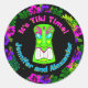 Un autocollant rond mignon pour une douche à thème tiki tropicale colorée, un imprimé hibiscus hawaïen sur un arrière - plan noir aux fleurs rose et bleue vives et à la verdure luxuriante est imprimé avec vos noms, un masque tiki vert vif et l'expression "C'est le temps de Tiki !"