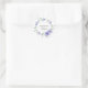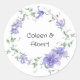 Autocollant rond élégant avec une couronne de clématite lilas et violette et une police manuscrite.