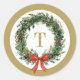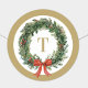 Un design d'autocollant de Noël rond élégant et intemporel, avec une couronne de verdure peinte à la main et un ruban rouge et un monogramme personnalisable en or. Modifiez facilement le monogramme avec l'initiale de votre nom de famille.