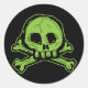 Un graphisme griffé vert et noir d'un crâne et des os croisés.