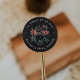 Un design chic et effrayant de mariage d'Halloween avec une illustration de crâne fleuri tropical surmontée de fleurs d'île orange et burgundy et de feuillage de jungle verte sur un fond noir fumé. Personnalisez cet autocollant de mariage d'Halloween unique et élégant avec un texte personnalisé dans une mise en page incurvée.